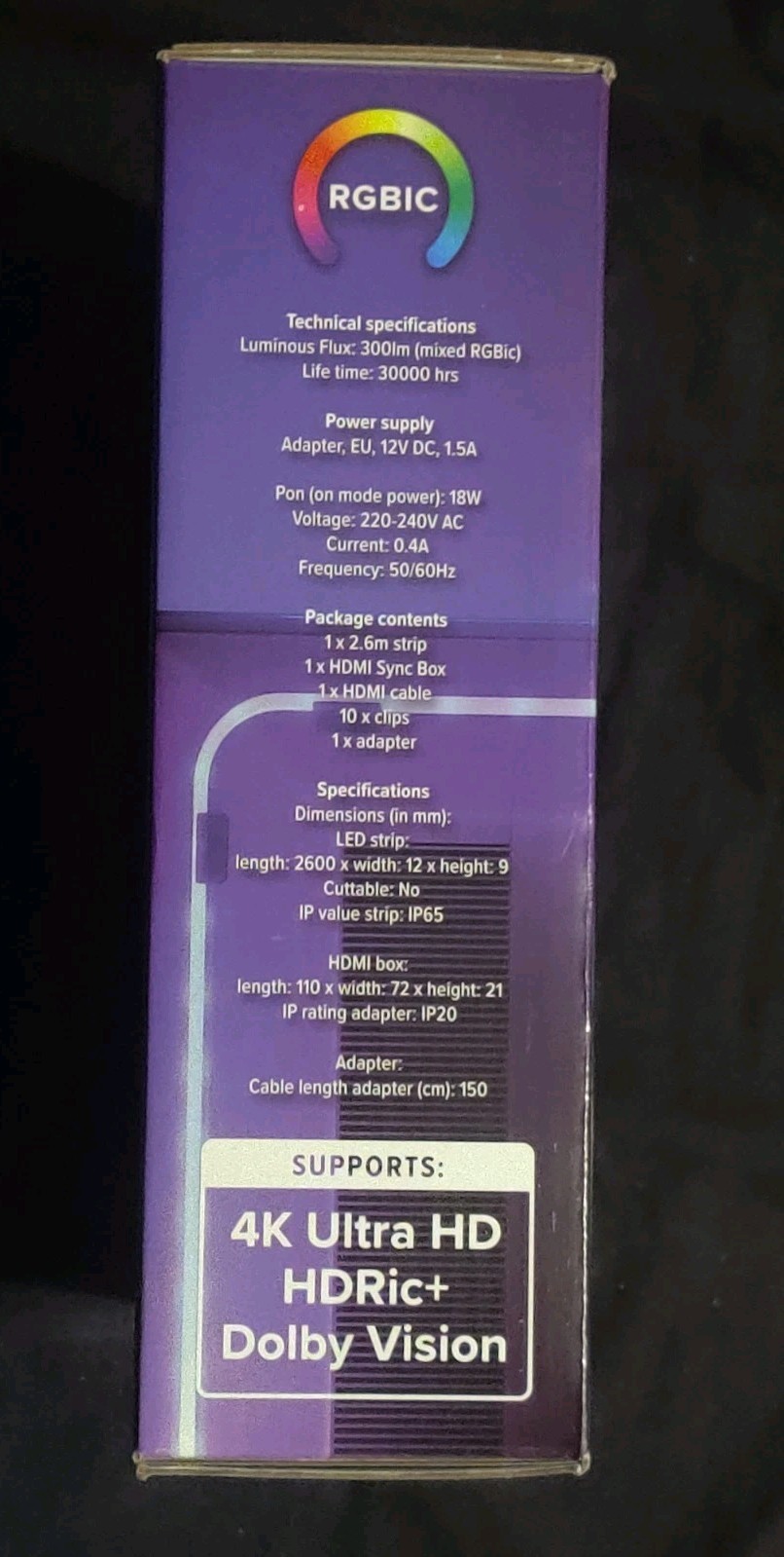 La box contient le Boîtier De Synchronisation, un Ruban Led de 2.6m (pour une Télé de 65 »), 1 câble HDMI et des clips pour attacher le ruban led a la télé.