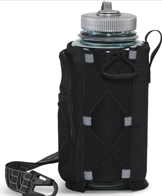 - Le compartiment pour bouteille d’eau est doté d’une sangle élastique réglable sur le côté gauche pour s’adapter à une large gamme de tailles de bouteilles d’eau.